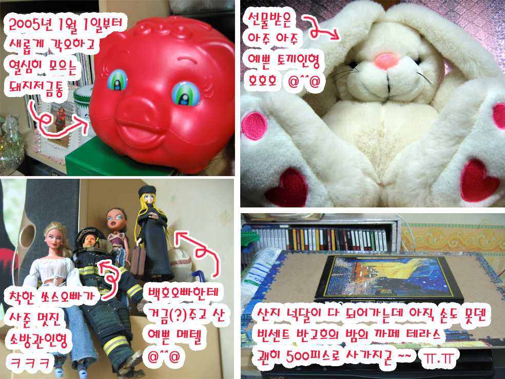 2005년 연말에 저 돼지저금통 깰거에요. 얼마가 될지는 그때 가봐야 알겠지만 일년에 한번씩 그렇게 하기로 마음을 먹었거든요. 많이 모으면 제가 한턱을~~ ㅋㅋㅋ ^^
