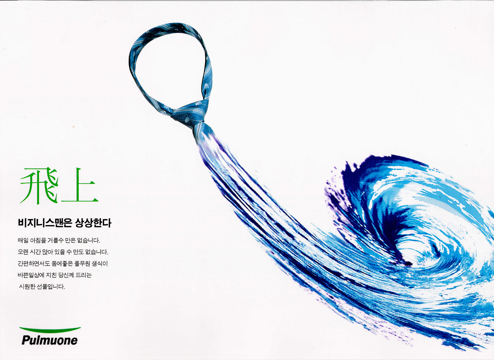 카피와 비주얼이 잘 맞지 않아 보이네요. '개천에서 용났다'는 것도 아닌것 같고... 목에걸고 소용돌이치는 급물살에 빠지는것 처럼 볼 수도 있는... 옛 얘기에 보면, 고승들이나 도사들이 생식을 하며... 그래서... 사무실에서 결가부좌 한 셀러리맨이 공중부양해서(의자가 없는) 업무를 보고있는 뒷모습을 비주얼로 한다면 '비상'과 맞지 않을까하는... 아이디어 필요하시면, Brain Storming Cafe로...^^;;