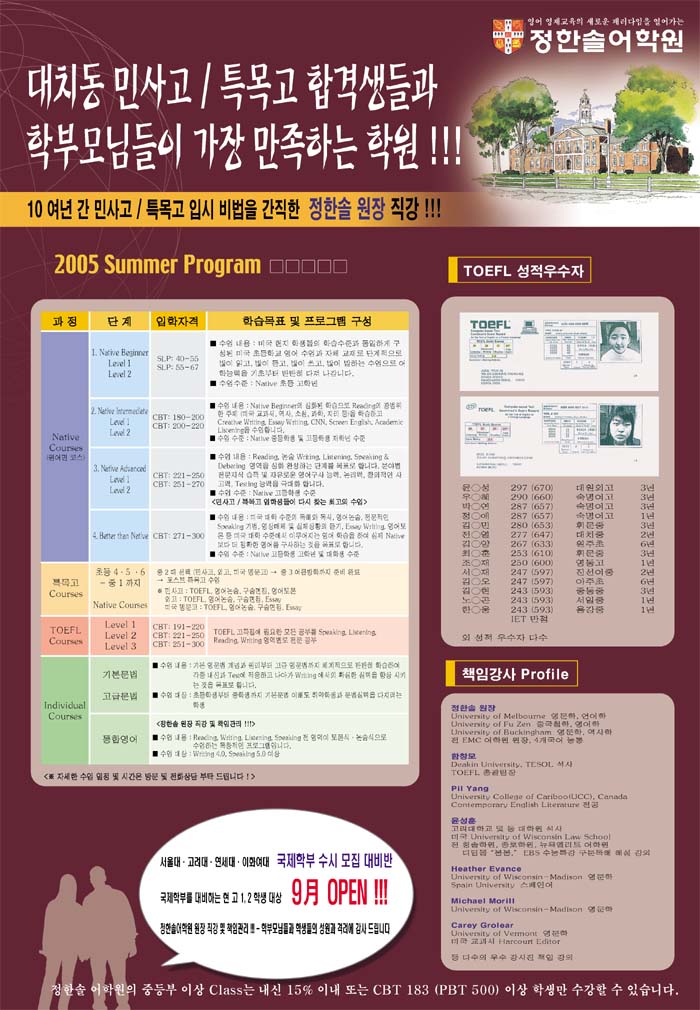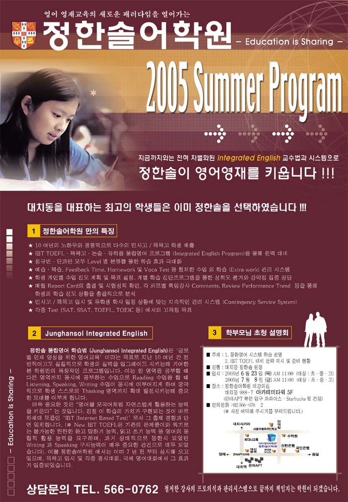 정한솔어학원이랑 섬머프로그램이랑 크기가 비슷하네여 정한솔~ 좀 많이 줄였슴 좋겠고 사진도 좀 키웠슴 좋겠고 좀만 손보시면 될것같은데 여하튼 굿 입니다. 바탕색은 진짜 아니네..여름인데^^