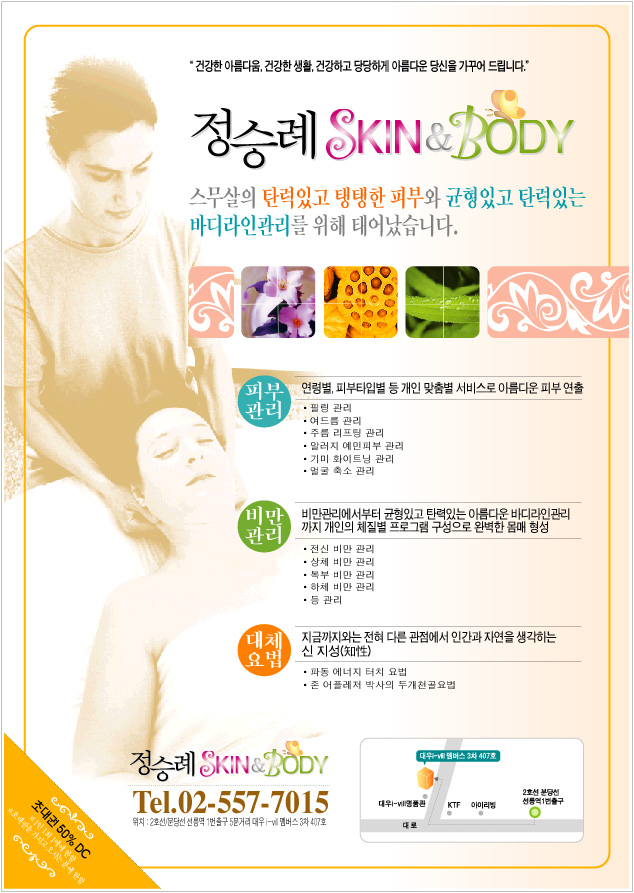 "건강한 아름다움, 건강한 생활, 건강하고 당당하게 아름다운 당신을 가꾸어 드립니다."