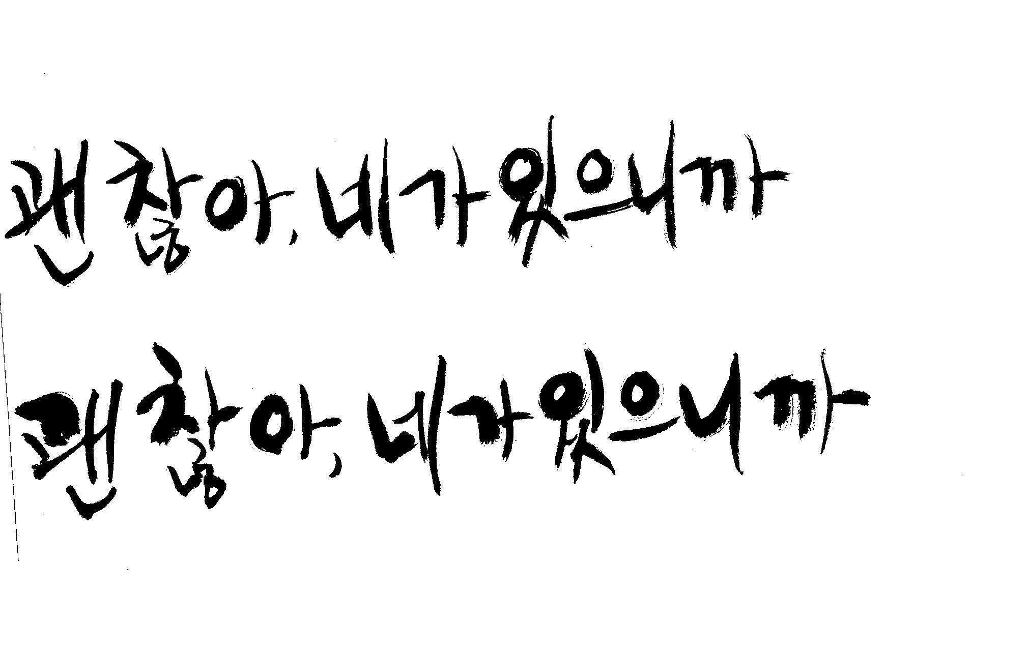 캘리 하나 부탁드릴께요. 김철호 일반 0 7628 2009.01.06 22:48 > > > > > 지금 작업중인 표지가있는데 > > > > 손글씨로 한번 작업해보려구요 > > > > 부탁드립니다. > > > > 괜 찮아, 네가 있으니까 > > >